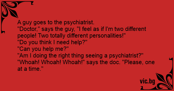 "Doctor," says the guy, "I feel as if I'm two different people! Two totally different personalities!"