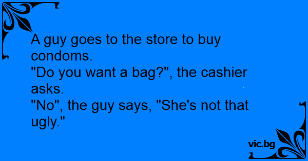 A guy walks into a pharmacy and buys a pack of condoms. The cashier asks him if he wants a bag. He responds, "No, she's not that ugly."