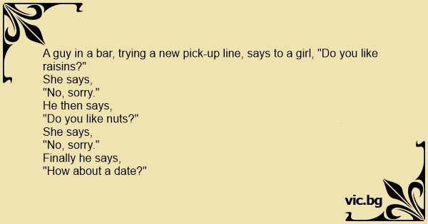A guy in a bar, trying a new pick-up line, says to a girl, "Do you like raisins?"