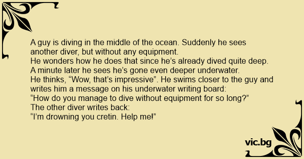 He thinks, “Wow, that’s impressive”. He swims closer to the guy and writes him a message on his underwater writing board:
