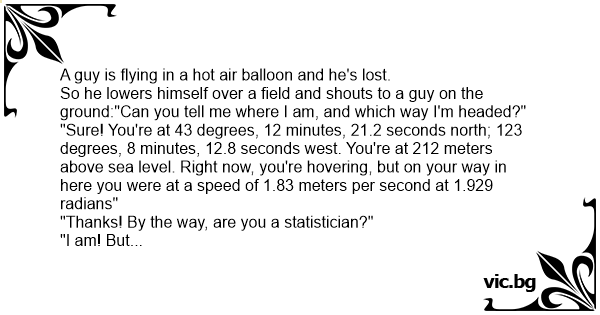 En man i en varmluftsballong insåg att han kommit vilse. Han minskade höjden och såg en kvinna nere på marken. Han sänkte sig ytterligare ner och ropade: - Ursäkta, kan du hjälpa mig? Jag hade...