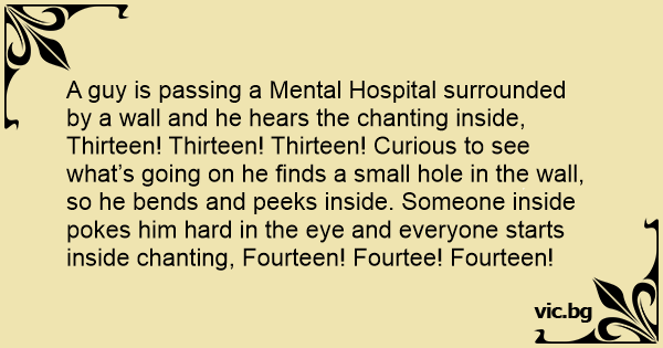 A guy is passing a Mental Hospital surrounded by a wall and he hears the chanting inside, Thirteen! Thirteen! Thirteen! Curious to see what’s going on he finds a small hole in the wall, so he bends and peeks inside. Someone inside pokes him hard in the eye and everyone starts inside chanting, Fourteen! Fourtee! Fourteen!