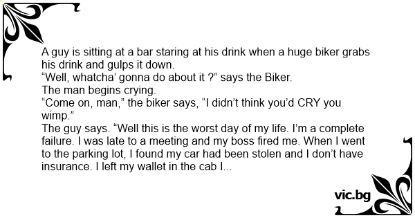 A guy is sitting at a bar staring at his drink when a huge biker grabs his drink and gulps it down.