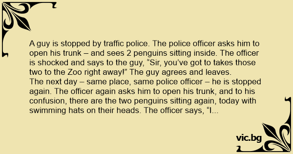 A guy is stopped by traffic police. The police officer asks him to open his trunk – and sees 2 penguins sitting inside. The officer is shocked and says to the guy, “Sir, you’ve got to takes those two to the Zoo right away!” The guy agrees and leaves.