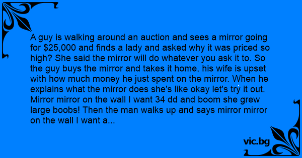 A guy is walking around an auction and sees a mirror going for $25,000 and finds a lady and asked why it was priced so high? She said the mirror will do whatever you ask it to. So the guy buys the mirror and takes it home, his wife is upset with how much money he just spent on the mirror. When he explains what the mirror does she's like okay let's try it out. Mirror mirror on the wall I want 34 dd and boom she grew large воовs! Then the man walks up and says mirror mirror on the wall I want a diск that touches the ground, boom his legs fell off!