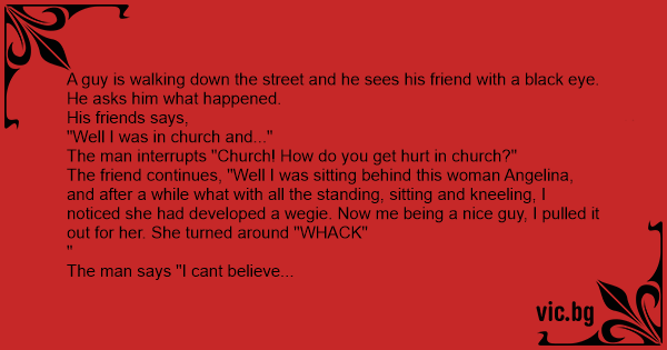 The friend continues, "Well I was sitting behind this woman Angelina, and after a while what with all the standing, sitting and kneeling, I noticed she had developed a wegie. Now me being a nice guy, I pulled it out for her. She turned around "WHACK"
