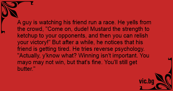 A guy is watching his friend run a race. He yells from the crowd, "Come on, dude! Mustard the strength to ketchup to your opponents, and then you can relish your victory!" But after a while, he notices that his friend is getting tired. He tries reverse psychology. "Actually, y'know what? Winning isn't important. You mayo may not win, but that's fine. You'll still get butter."