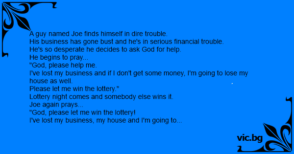 Pagyvenęs žydas visą gyvenimą meldėsi Dievui, norėdamas išmelsti stambų laimėjimą loterijoje. Kiekvieną dieną jis nenuilsdamas kalbėjo tokią maldą, kol pagaliau Dievui visai įkyrėjo. Eilinį kartą...