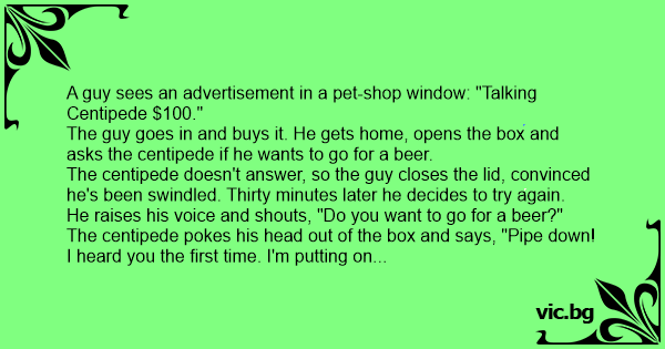 The guy goes in and buys it. He gets home, opens the box and asks the centipede if he wants to go for a вееr.
