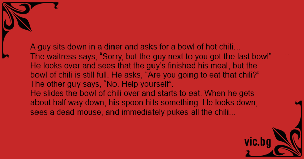 He slides the bowl of chili over and starts to eat. When he gets about half way down, his spoon hits something. He looks down, sees a dead mouse, and immediately pukes all the chili back into the bowl.