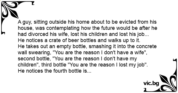 A guy, sitting outside his home about to be evicted from his house, was contemplating how the future would be after he had divorced his wife, lost his children and lost his job...