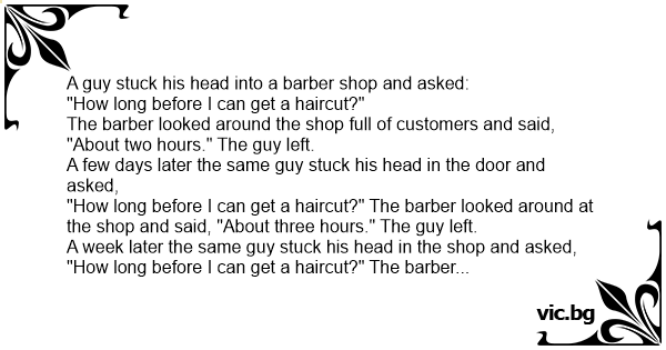"How long before I can get a haircut?" The barber looked around at the shop and said, "About three hours." The guy left.