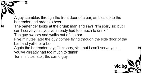 The bartender looks at the drunк man and says,”I’m sorry sir, but I can’t serve you…you’ve already had too much to drink.”