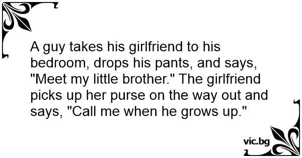 A guy takes his girlfriend to his bedroom, drops his pants, and says, "Meet my little brother." The girlfriend picks up her purse on the way out and says, "Call me when he grows up."