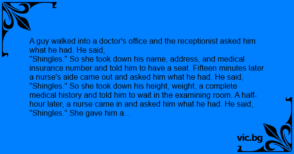 "Shingles." So she took down his height, weight, a complete medical history and told him to wait in the examining room. A half-hour later, a nurse came in and asked him what he had. He said,