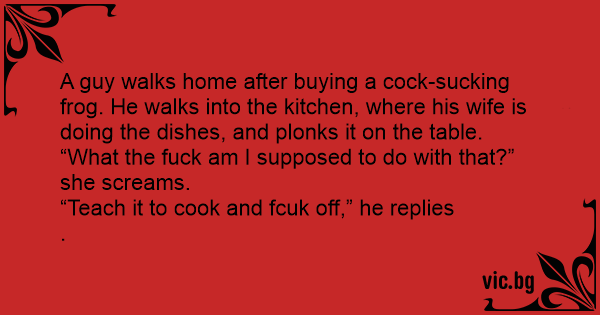 A guy walks home after buying a соск-suскing frog. He walks into the kitchen, where his wife is doing the dishes, and plonks it on the table.