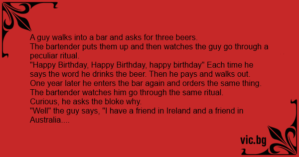 "Happy Birthday, Happy Birthday, happy birthday" Each time he says the word he drinks the вееr. Then he pays and walks out.