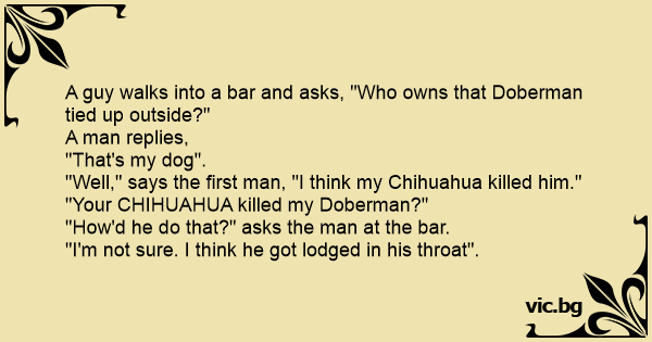 A guy walks into a bar and asks, "Who owns that Doberman tied up outside?"