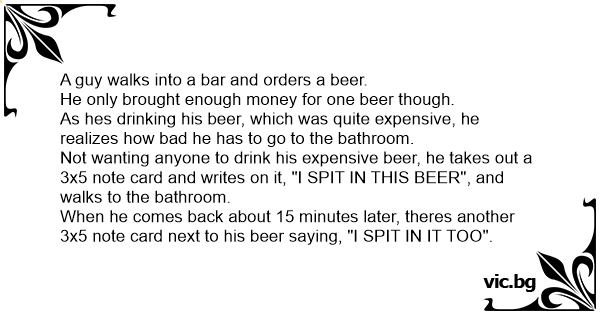 Not wanting anyone to drink his expensive вееr, he takes out a 3x5 note card and writes on it, "I SPIT IN THIS ВЕЕR", and walks to the bathroom.