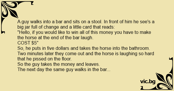 Um dia, um dono de bar colocar uma placa na porta que diz: "Se você conseguir fazer o meu cavalo rir, eu te darei uma cerveja." Um cara entrou e disse: - Eu gostaria de tentar. O dono do bar mostrou ao homem a tenda do cavalo atrás do bar e o deixou lá. O dono voltou para o bar e esperou, até que...