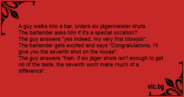 En man kommer fram till baren och beställer 6 stycken whiskey. Bartendern frågar om det är något speciellt han ska fira. – Jag ska fira min första avsugning! – I så fall bjuder jag på den sjunde. –...