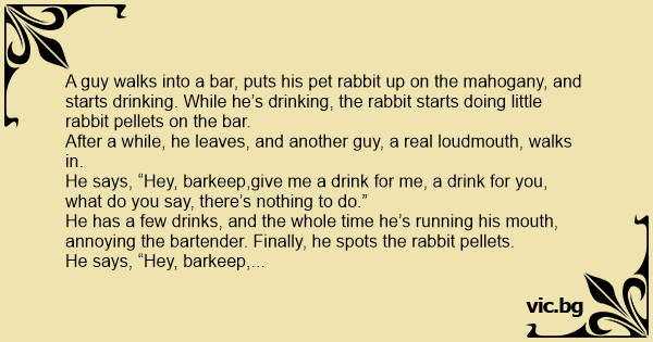 A guy walks into a bar, puts his pet rabbit up on the mahogany, and starts drinking. While he’s drinking, the rabbit starts doing little rabbit pellets on the bar. After a while, he leaves, and another guy, a real loudmouth, walks in. He says, “Hey, barkeep,give me a drink for me, a drink for you, what do you say, there’s nothing to do.” He has a few drinks, and the whole time he’s running his mouth, annoying the bartender. Finally, he spots the rabbit pellets. He says, “Hey, barkeep, what are these?” The bartender says, “They’re smart pills.” The loudmouth says, “Can I try a few?” The bartender says, “Knock yourself out.” The guy pops a few in his mouth, chews for a while, then spits them out and exclaims, “Yuck! These taste like fсuкing sh1t!” The bartender says, “You’re getting fсuкing smarter already.”