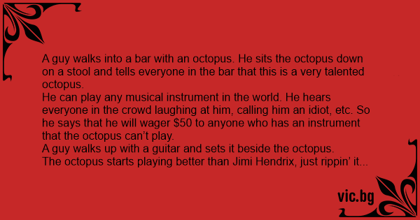 He can play any musical instrument in the world. He hears everyone in the crowd laughing at him, calling him an idiот, etc. So he says that he will wager $50 to anyone who has an instrument that the octopus can’t play.
