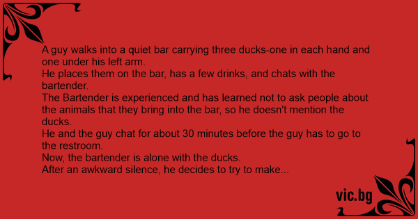 A guy walks into a quiet bar carrying three ducks-one in each hand and one under his left arm. He places them on the bar, has a few drinks, and chats with the bartender. The Bartender is experienced and has learned not to ask people about the animals that they bring into the bar, so he doesn't mention the ducks. He and the guy chat for about 30 minutes before the guy has to go to the restroom. Now, the bartender is alone with the ducks. After an awkward silence, he decides to try to make conversation. "What's your name?" He says to one of the ducks. "Huey," answers the first duck. "How's your day been, Huey?" "Great. Lovely day. Had a ball. Been in and out of puddles all day." "Oh, that's nice," says the bartender. Then he says to the second duck, "And what's your name?". "Dewey," comes the answer. "So how's your day been, Dewey?" "Great. Lovely day. Had a ball. Been in and out of puddles all day. If I had the chance, I would do it all again." So the bartender turns to the third duck and says, "So, you must be Louie." "No," growls the third duck, "My name is Puddles. And don't ask about my day."