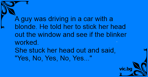 A husband is driving with her blonde wife, the husband says "Can you stick your head out the window if the blinker works?" T hen the blonde sticks her head out the window and replies, "Yes, No,...