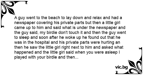 A guy went to the beach to lay down and relax and had a newspaper covering his private parts but then a little girl came up to him and said what is under the newspaper and the guy said, my birdie don't touch it and then the guy went to sleep and soon after he woke up he found out that he was in the hospital and his private parts were hurting an then he saw the little girl right next to him and asked what happened and the little girl said when you were asleep I played with your birdie and then it spat on me so I broke the neck, busted the eggs, and burned its nest.