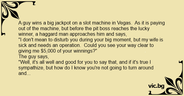 A guy wins a big jackpot on a slot machine in Vegas. As it is paying out of the machine, but before the pit boss reaches the lucky winner, a haggard man approaches him and says,