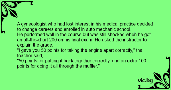 A gynecologist who had lost interest in his medical practice decided to change careers and enrolled in auto mechanic school.