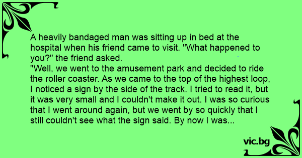 "Well, we went to the amusement park and decided to ride the roller coaster. As we came to the top of the highest loop, I noticed a sign by the side of the track. I tried to read it, but it was very small and I couldn't make it out. I was so curious that I went around again, but we went by so quickly that I still couldn't see what the sign said. By now I was determined, so I went around a third time. As we reached the top I stood up in the car to get a better view."