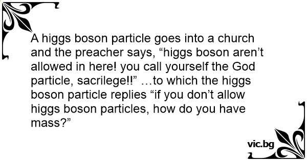 A higgs boson particle goes into a church and the preacher says, “higgs boson aren’t allowed in here! you call yourself the God particle, sacrilege!!” …to which the higgs boson particle replies “if you don’t allow higgs boson particles, how do you have mass?”
