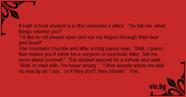 The counselor chuckle and after a long pause says, “Well, I guess that means you’ll either be a surgeon or psychotic killer. Tell me more about yourself.” The student paused for a minute and said; “Well, to start with, I’m never wrong.” “Other people adore me and do exactly as I say…or if they don’t, they should.” The counselor smiles and says; “Surgeon it is!”