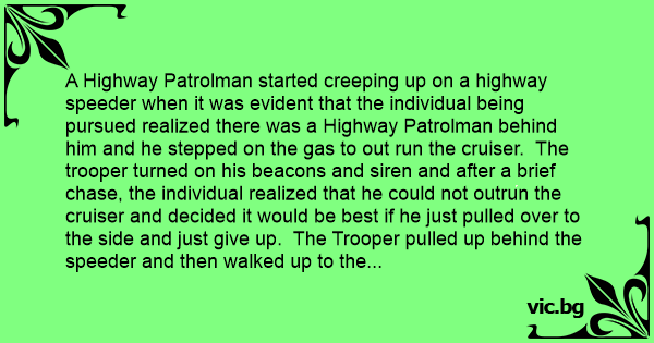 A Highway Patrolman started creeping up on a highway speeder when it was evident that the individual being pursued realized there was a Highway Patrolman behind him and he stepped on the gas to out run the cruiser. The trooper turned on his beacons and siren and after a brief chase, the individual realized that he could not outrun the cruiser and decided it would be best if he just pulled over to the side and just give up. The Trooper pulled up behind the speeder and then walked up to the driver's side window. He said,