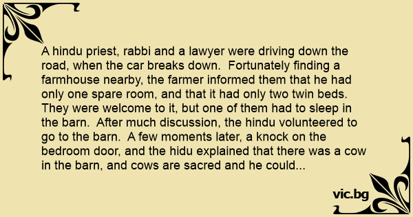 A hindu priest, rabbi and a lawyer were driving down the road, when the car breaks down. Fortunately finding a farmhouse nearby, the farmer informed them that he had only one spare room, and that it had only two twin beds. They were welcome to it, but one of them had to sleep in the barn. After much discussion, the hindu volunteered to go to the barn. A few moments later, a knock on the bedroom door, and the hidu explained that there was a соw in the barn, and cows are sacred and he could not possibly sleep in the barn with a соw. Annoyed, the rabbi volunteered. a few moments later, a knock on the door. The rabbi explained that there was a pig in the barn and that he, being very orthodox, could not possibly spend the evening in the barn with the origin of pork. Finally the lawyer said that he would go to the barn. A few moments later there was a knock on the door. It was the соw and the pig!!!