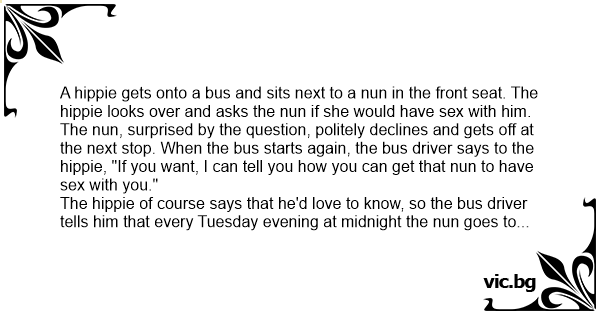 The nun, surprised by the question, politely declines and gets off at the next stop. When the bus starts again, the bus driver says to the hippie, "If you want, I can tell you how you can get that nun to have sеx with you."