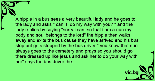 A hippie in a bus sees a very beautiful lady and he goes to the lady and asks " can I do my way with you? " and the lady replies by saying "sorry i cant so that i am a nun my body and soul belongs to the lord" the hippie then walks away and exits the bus cause they have arrived and his bus stop but gets stopped by the bus driver " you know that nun always goes to the cemetery and prays so you should go there dressed up like jesus and ask her to do your way with her" says the bus driver the hippie says okay and waits till midnight and goes to the cemetery and sees the nun praying then he put his jesus outfit and asks the nun to do her way with her and he shall forgiver her sins and she says yes but do it from behind so i will not lose my virginity and they start to make love and when they were done the hippie rips his outfit of and says surprise its me the hippie! and then the nun rips her dress of and screams surprise its me the bus~driver!