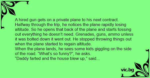 A hired gun gets on a private plane to his next contract. Halfway through the trip, he notices the plane rapidly losing altitude. So he opens that back of the plane and starts tossing out everything he doesn’t need. Grenades, guns, ammo unless it was bolted down it went out. He stopped throwing things out when the plane started to regain altitude.