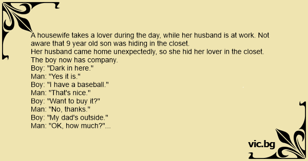 El marido llega a casa sin avisar, y la esposa tiene que esconder a su amante, asi que lo mete en el armario. Una vez alli, el tio se queda de piedra cuando oye una voz a su lado que le dice: -...
