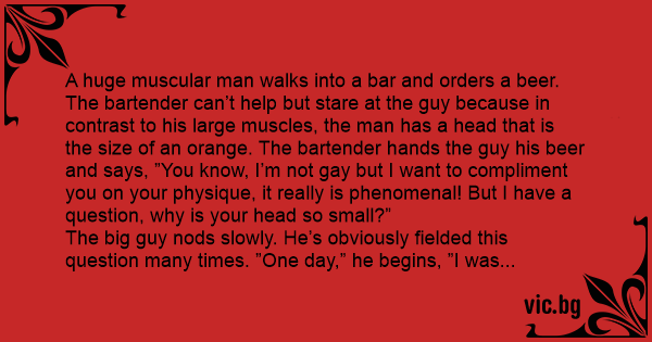A huge muscular man walks into a bar and orders a вееr. The bartender can’t help but stare at the guy because in contrast to his large muscles, the man has a head that is the size of an orange. The bartender hands the guy his вееr and says, ”You know, I’m not gаy but I want to compliment you on your physique, it really is phenomenal! But I have a question, why is your head so small?”