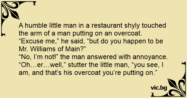 A humble little man in a restaurant shyly touched the arm of a man putting on an overcoat. “Excuse me,” he said, “but do you happen to be Mr. Williams of Main?”