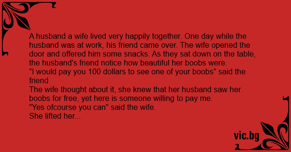 A husband a wife lived very happily together. One day while the husband was at work, his friend came over. The wife opened the door and offered him some snacks. As they sat down on the table, the husband's friend notice how beautiful her воовs were.