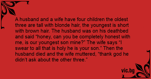 A husband and a wife have four children the oldest three are tall with blonde hair, the youngest is short with brown hair. The husband was on his deathbed and said “honey, can you be completely honest with me, is our youngest son mine?” The wife says “I swear to all that is holy he is your son.” Then the husband died and the wife muttered, “thank god he didn’t ask about the other three.”
