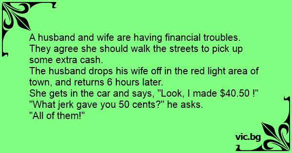 The husband drops his wife off in the red light area of town, and returns 6 hours later.