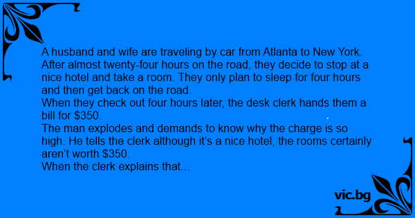 A husband and wife are traveling by car from Atlanta to New York. After almost twenty-four hours on the road, they decide to stop at a nice hotel and take a room. They only plan to sleep for four hours and then get back on the road.