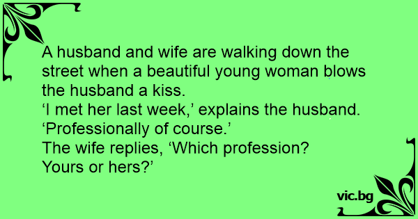 A husband and wife are walking down the street when a beautiful young woman blows the husband a kiss.