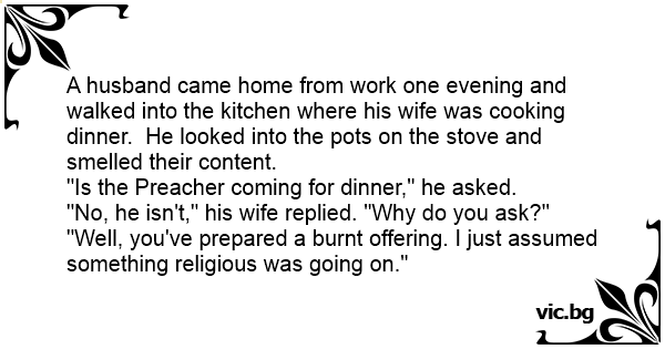A husband came home from work one evening and walked into the kitchen where his wife was cooking dinner. He looked into the pots on the stove and smelled their content.