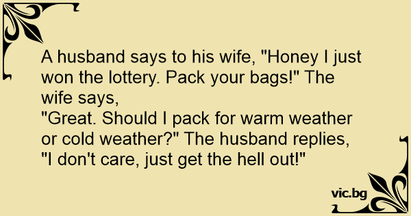 A husband says to his wife, "Honey I just won the lottery. Pack your bags!" The wife says,